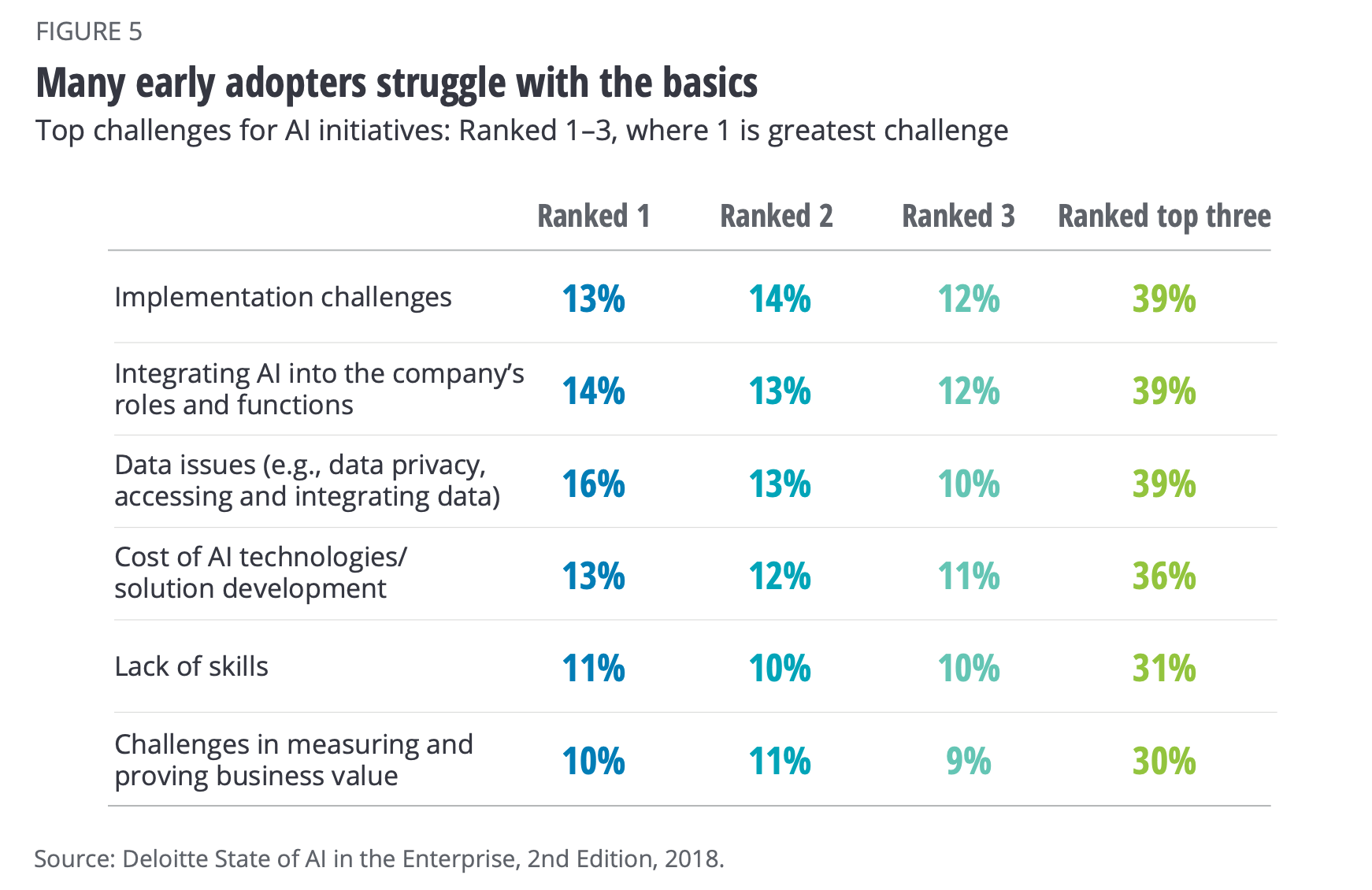 If teams don’t have experience with AI tools, there can be a significant learning curve. When Deloitte asked business leaders what the main challenges with AI were, they cited implementation and integrating AI into existing tech stacks.
