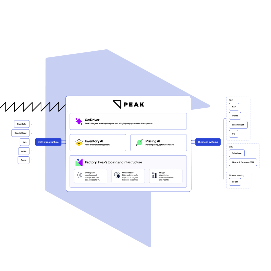 Cloud native and API-first, the Peak platform integrates seamlessly with your existing systems (e.g. MS, ERP and CRM systems) and enhances them with your own AI, tailored to your business.