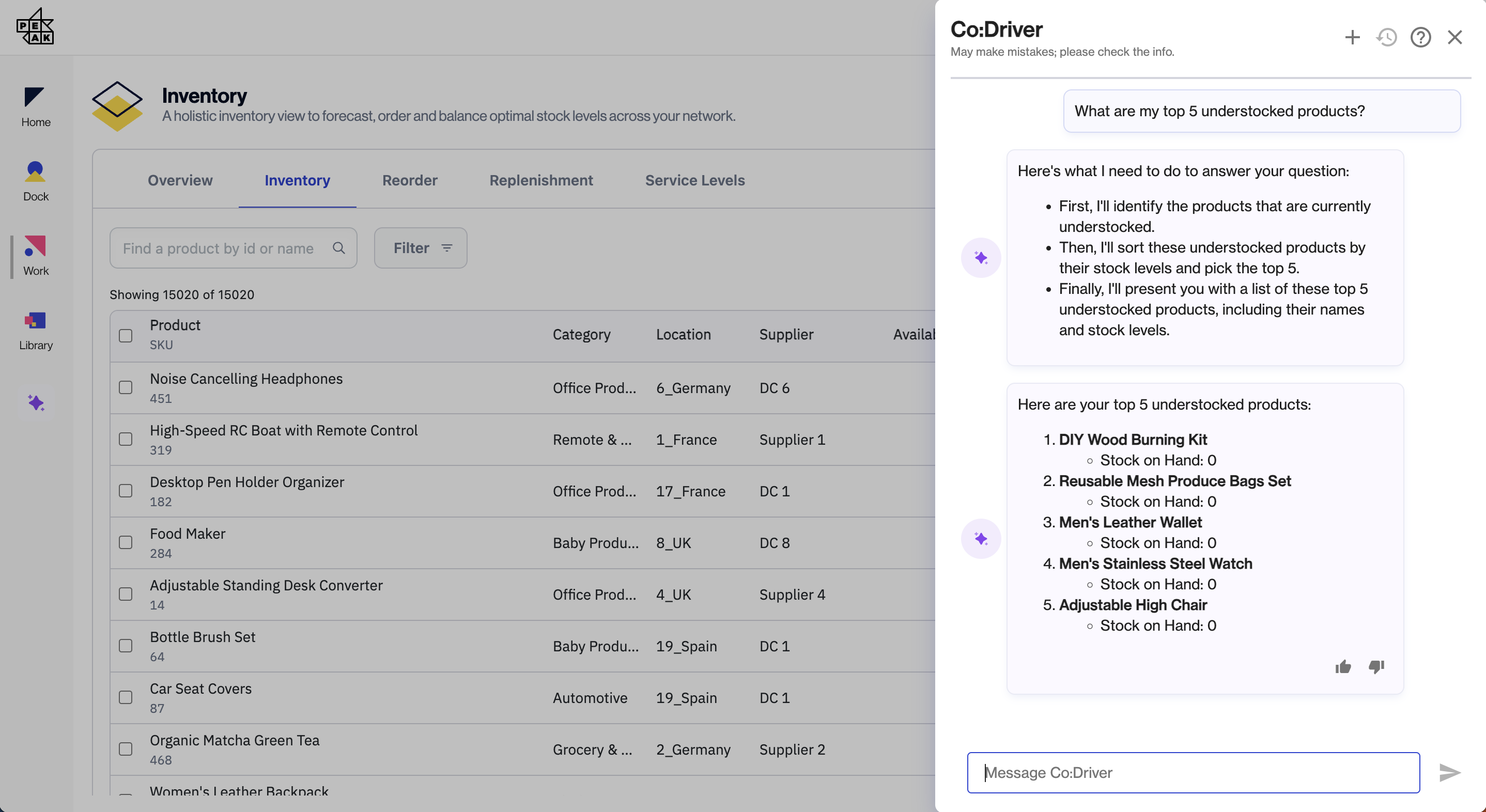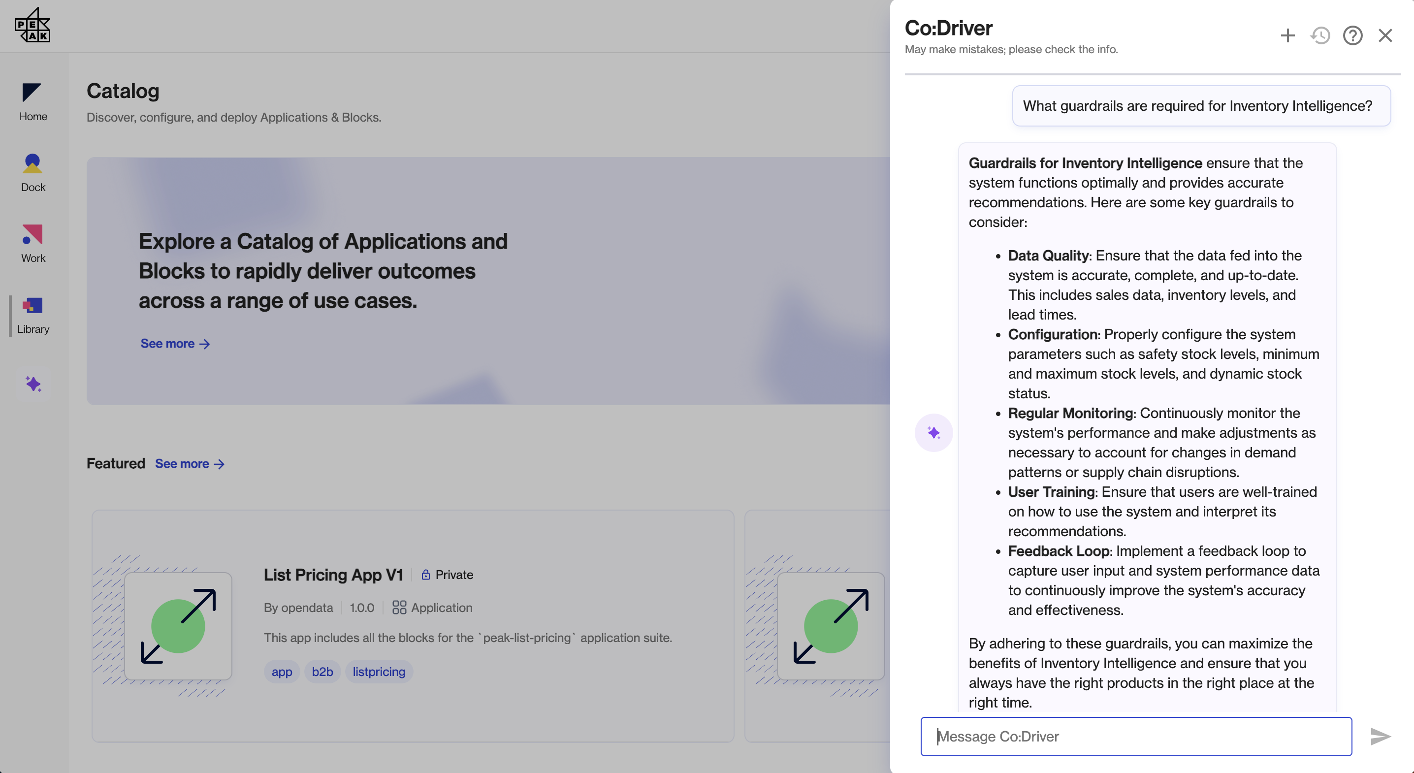 The team have been focused on delivering more amazing functionality into Co:Driver, our agentic generative AI assistant that was first launched at AltitudeX in October 2023. Co:Driver brings the latest in generative AI capabilities to all of Peak’s products. Using Large Language Model (LLM) agentic workflows to power a multi-purpose conversational interface, you can ask any questions about your data or the AI that’s driving our inventory and pricing products. We’re incredibly excited to showcase our first three innovations in this space that we’re bringing to general availability today.