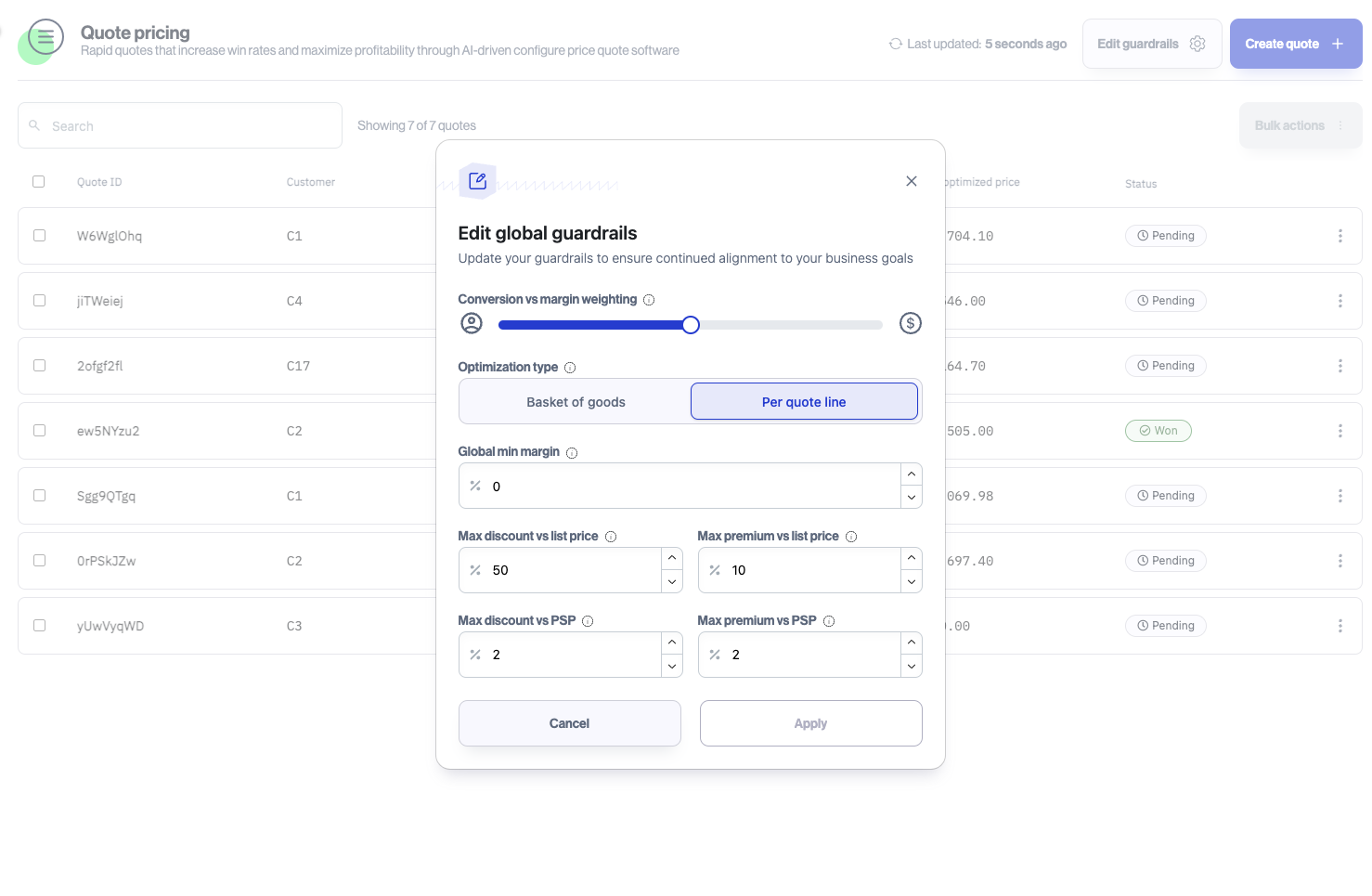 We’ve also taken this approach with the latest improvements to our quote pricing offering, providing those same pricing managers with deeper functionality. Quote pricing now has the ability to set and change business guardrails, allowing you to make changes in-line with your pricing strategy, combined with an improved ability to quickly generate geo-specific prices. Our direct integrations into your ERP system also now ensures that your CPQ process is enriched by AI, with optimized quotes put in the hands of your sellers as quickly as possible.