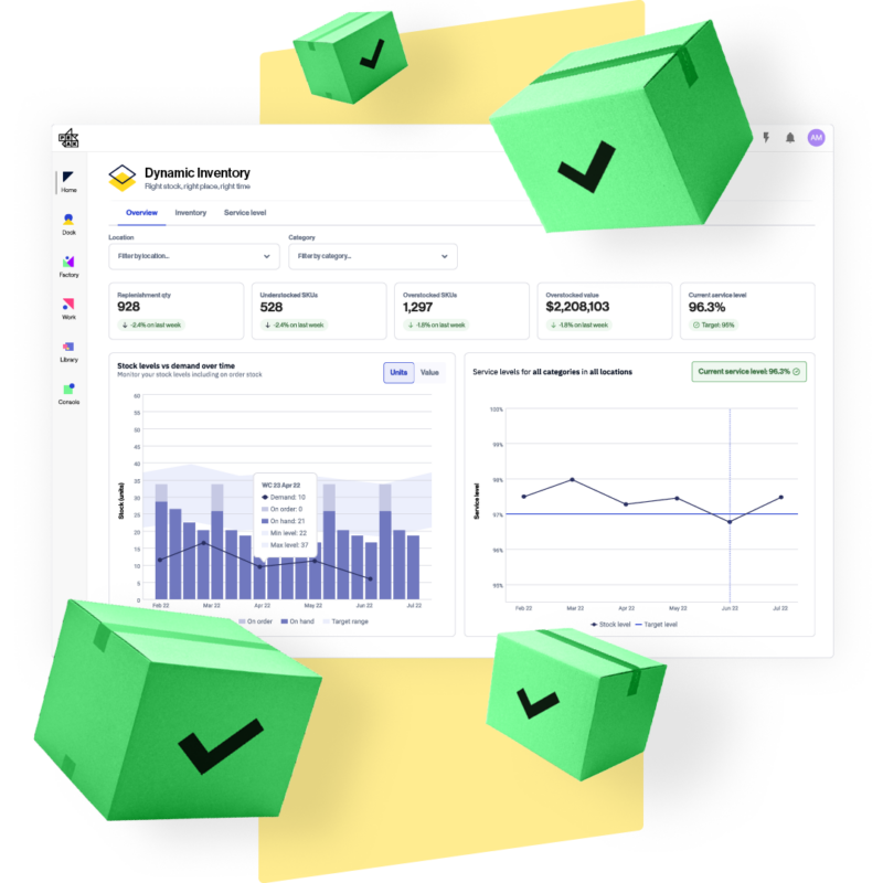 Inventory Intelligence is a suite of stock optimization applications. It uses AI to optimize your stock holdings, putting the right products, in the right place, at the right time. Meaning you can hit your target service levels and reduce excess stock holdings.