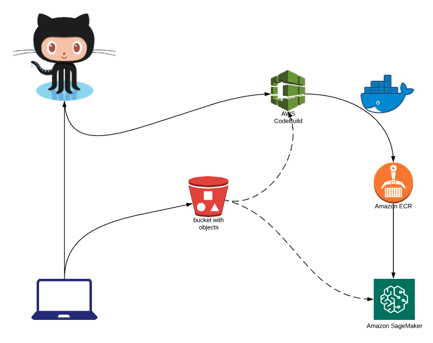 Here we see the developer writing their inference (API) code locally and pushing it to source control, in this case Github. They may also be generating model files and pushing them to S3 for storage and retrieval later.