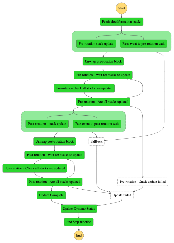 In the Step Function we we would then update the stacks twice. The first update would set the `RotateToken` parameter to be `false` therefore effectively deleting any resource which uses the access token value. The second update would then set the `RotateToken` value to be `true`. This would recreate all the previously deleted resources and force them to pull through the updated access token value from Secrets Manager.