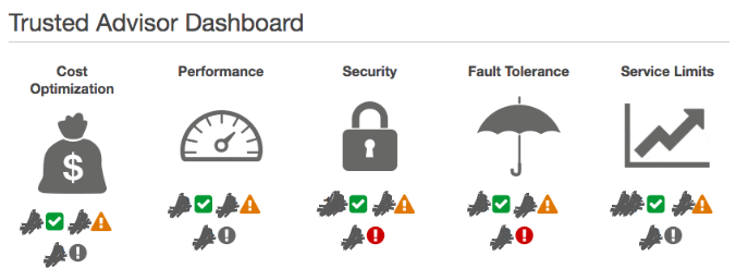 Along comes the Trusted Advisor (TA) tool, another AWS service with the goal of providing help by monitoring AWS resource limits and usage. TA is a customized cloud expert which helps companies optimize their AWS resources. For the remainder of this section, let’s focus on the sub-service of Service Limits, but for illustrative purposes the image below shows the landing page dashboard in the AWS console, along with other services provided by TA.