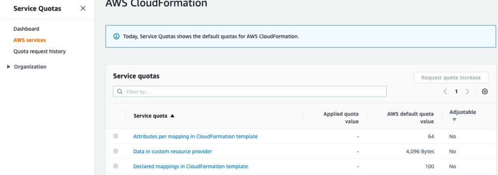 The Service Quotas tool allows you to monitor and manage AWS resource limits for your account, from one centralized location. This tool also supplies a full list of AWS services and default quota values for your account. If you wish to investigate your own limits, or discover which resources you can adjust, I recommend visiting the Service Quotas Console and selecting the AWS Services option from the list. To illustrate this, the image below show the console view for some of the default quotas on our account for the CloudFormation services. I didn’t choose CloudFormation for any other reason than it being one of my favorite services, but I digress! You may notice that the three quotas identified below cannot be adjusted – so tough luck if you had planned on declaring more than 100 mappings in your yaml/json file. If a value is populated in the Applied quote value column, then this just implies that you have previously requested an increase for this service and the value will automatically override the default value.